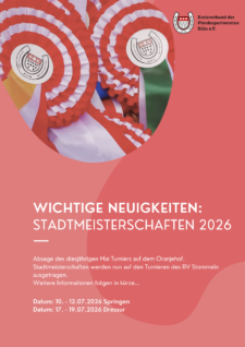 Wichtige Neuigkeiten bezüglich der Stadtmeisterschaften 2026: wie sicher der ein oder andere schon gehört hat, wurde das diesjährige Mai Turnier auf dem Oranjehof mit den Kölner Stadtmeisterschaften vom 30.04.-03.05.2026 abgesagt. Eine offizielle Erklärung und Erläuterung …